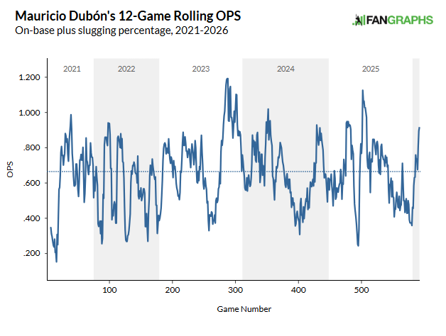 Mauricio Dubón (5): He’s starting and a .371 BABIP has his overall stats looking great (.333/.362/.556). There is no signs of the 31-year-old breaking out. He’s posted a .917 OPS over several other stretches over the past six years and the improvement has yet to stick.
