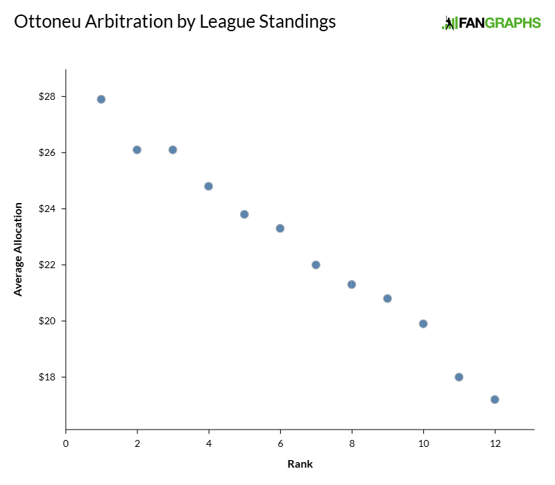 Is there anything actionable you can do with this knowledge? Probably not. If you’re finishing in the top three of your league, you’re probably expecting to get hit with a bunch of arbitration dollars at the start of the offseason. It might be a handy guide for planning if you’re trying to work out what your offseason budget is going to look like during the summer — you could toss in an expected allocation amount into your projected budget based on where you think you’re going to finish.