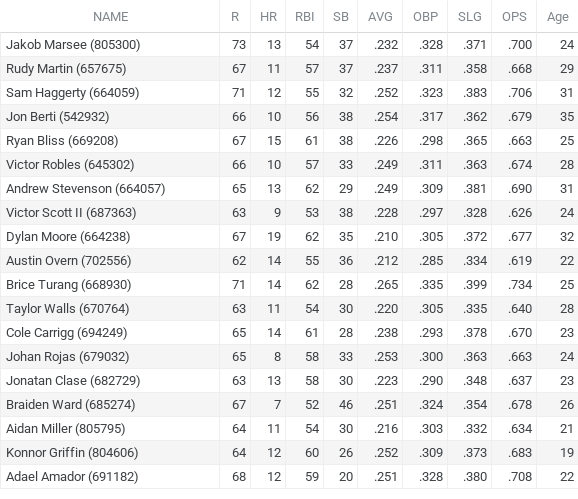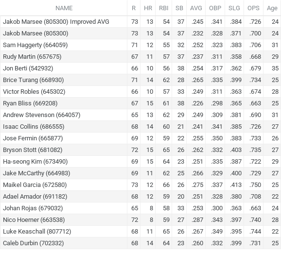 The disconnect between Marsee’s 2025 season and this projection is the 60 points or more in batting average. I’m going to go against this projection (hopefully, a clearer picture emerges once other projections become available).