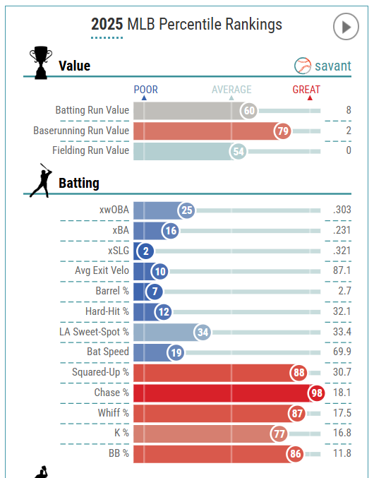 As for the stolen bases, I don’t see any upside after this sprint speed dropped from 28.3 ft/s (74th percentile) to 26.7 ft/s (32nd percentile) since 2023. It could be even lower with only two second-half attempts.