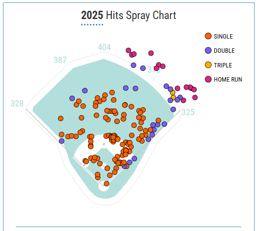 Besides having a solid base coming into 2025, Laureano made two improvements. His contact% jumped from 70.8% to 74.8%, which is his highest since 2021. With more contact, his strikeout rate dropped from 31% to 24%, pushing his batting average up to .281.