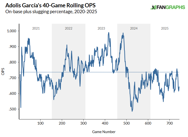 Garcia’s production had been steady until he dealt with a forearm injury in May 2024 and a lingering knee injury that ended his 2024 season. Then in 2025, he dealt with oblique, ankle, and quadricep injuries. His .665 OPS and 547 PA were the lowest since 2020. I’m unsure if he was ever healthy. Since coming back from the forearm injury, he has posted a .654 OPS. Not good, Bob.