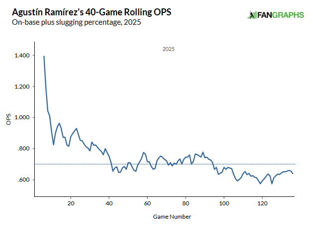 Ramirez is going to have to improve his catching skills because, even on the Marlins, a .287 OBP isn’t going to play at first base or DH. As the league adjusted to him, his OPS just kept hitting new lows.