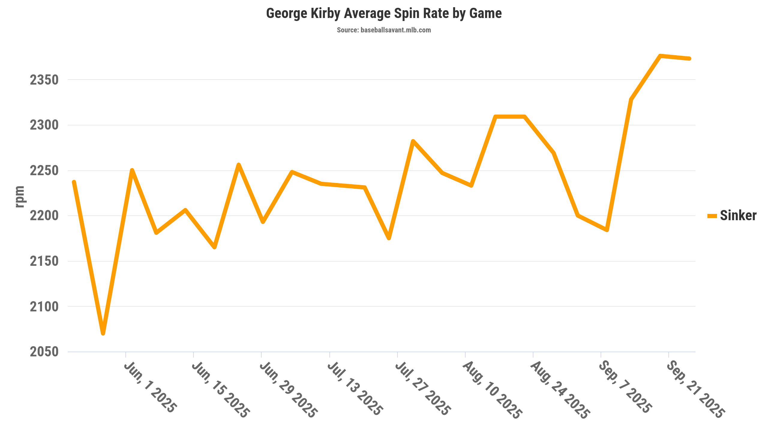 In Kirby’s last three starts, the sinker’s Stuff+ increased from 55 to 62.