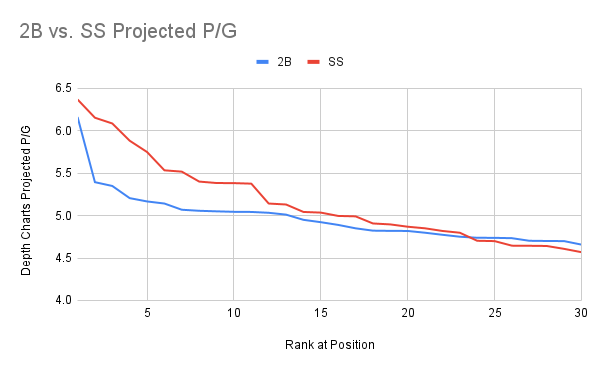 Second base is deeper than you think. At least relative to the top of the position. Part of this is because the top of the position is so weak that the gap from the 12th best option to the 24th best option isn’t that huge. There were 59 2B who received arb and just 39 SS. If we allow 2B/SS eligible players to qualify at both, that goes up to 62 SS and 59 2B, which is still very close. Look at this comparison of 2B and SS based on current Depth Charts projections: