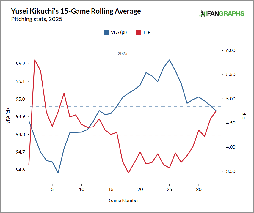 I think the thing that worries me the most is the effectiveness of Kikuchi’s fastball. He’s one of the hardest throwing left-handers in baseball, but he’s entering his age-35 season in 2026. His velocity dropped early last year, and even though he regained it in the middle of the season, it dropped again in August and September and his results tanked along with it.