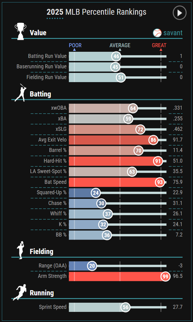 Okamoto is coming over from the NPB with a prestigious power track record. He is second only to Munetaka Murakami in homers since 2019 with 214. Unlike Barger, he does so with strong plate skills that he’s been honing the last few seasons. He brought his K% down 8 pts from 2023 to 2025 (11%) and putting up an identical 11% BB% with it. His .271 ISO and 1.0 BB/K likely won’t fully translate without any degradation, but I took his projections (.210, 0.5) and looked at seasons in that range (.200-.220 ISO, 0.4-0.6 BB/K) over the last four years. The 27 players who qualified averaged 28 HRs, ranging from 20 to 34. Let’s turn it up a bit to the 0.55-0.75 BB/K and .240-.275 ISO levels and we find nine players who averaged 34 HRs, all reaching at least 30.