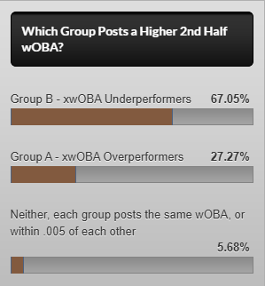 Let’s start with the answers to the poll questions. As voted on by two-thirds of you, Group B did indeed post a higher wOBA during the second half, recording a .342 mark, versus a .321 mark for Group A. What’s interesting here is that Group A overperformed again, but by a significantly smaller degree than in the first half, while Group B also underperformed again, by a larger degree than Group A’s overperformance, but still a smaller degree than in the first half. Perhaps park factors played a role and/or other skills not being captured by the equation, like horizontal batted ball direction.