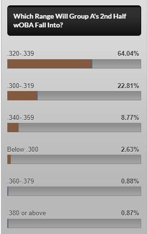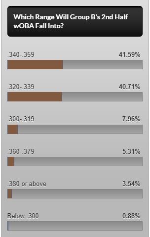 Similar to the overall vote for higher wOBA, just under two-thirds of you voted that Group A’s second half wOBA would fall into the .320-.339 range, which matches up with the .321 xwOBA mark they posted (versus a .355 actual mark). Nearly 23% thought regression would really take its tolls, overcorrecting in the second half to bring down the hitters’ full season wOBA more in line with their first half xwOBA.