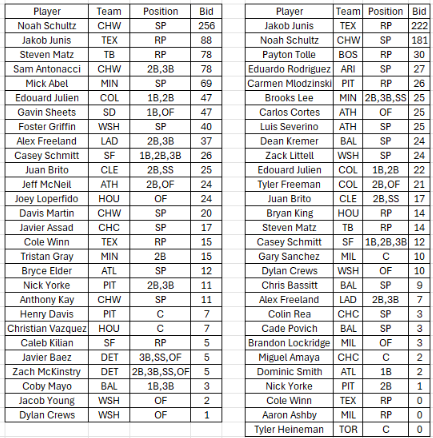 : Welcome, here are the winning bids for the two 15-team Tout Wars leagues.